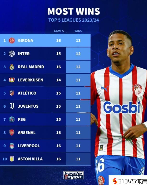 本赛季五大联赛赢球场次榜:赫罗纳13胜居首,国米皇马均12胜