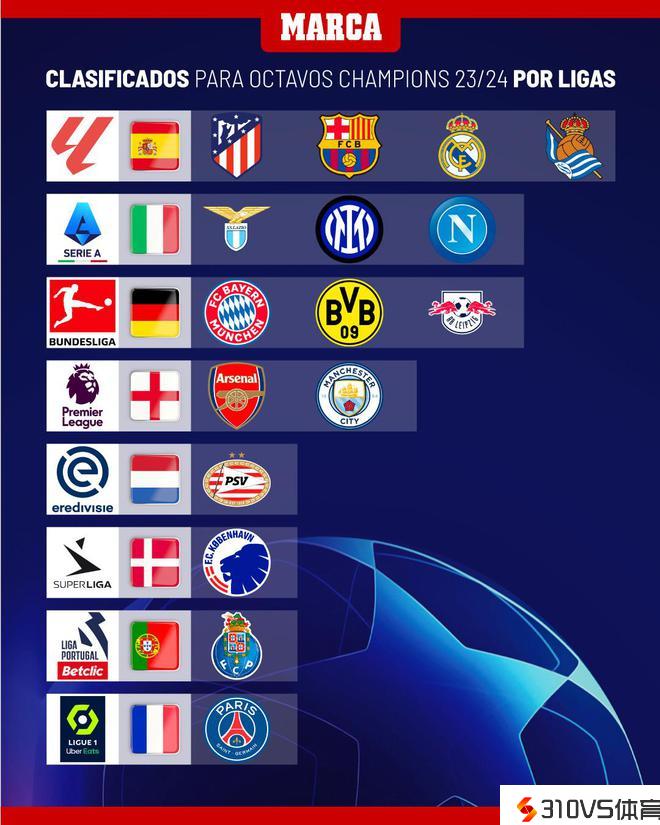 欧冠16强联赛散布:五大联赛占据13席,西甲4队全部晋级