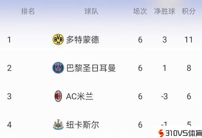 3分钟后,AC米兰也依托普利西奇的进球1-1扳平纽卡斯尔,而多特蒙德则照旧1-1巴黎。这时分,积分榜又发作变化,多特11分第一,巴黎8分升回第二,纽卡6分降回第三,米兰垫底。