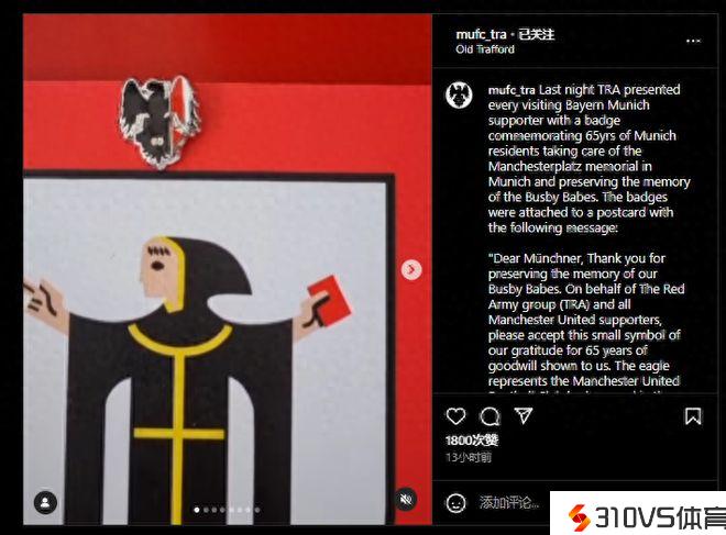 亲爱的慕尼黑,感谢你们保管了巴斯比宝贝的记忆,曼联的球迷TRA和一切曼联球迷,希望你们能接受这一个小小的意味,以表达我们关于65年来对曼联的好意,徽章上的老鹰代表了曼联俱乐部,并且在1958年足总杯决赛上运用,这场竞赛在慕尼黑空难发作不到3个月内举行,并且曾经被采用为TRA的标志之一。