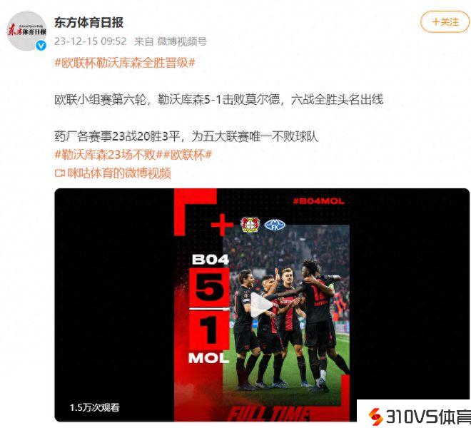 欧联杯勒沃库森全胜晋级,现为五大联赛独一不败球队