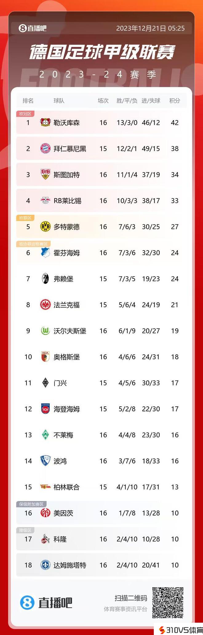 德甲积分榜:拜仁少赛一场距榜首4分 药厂联赛16轮不败