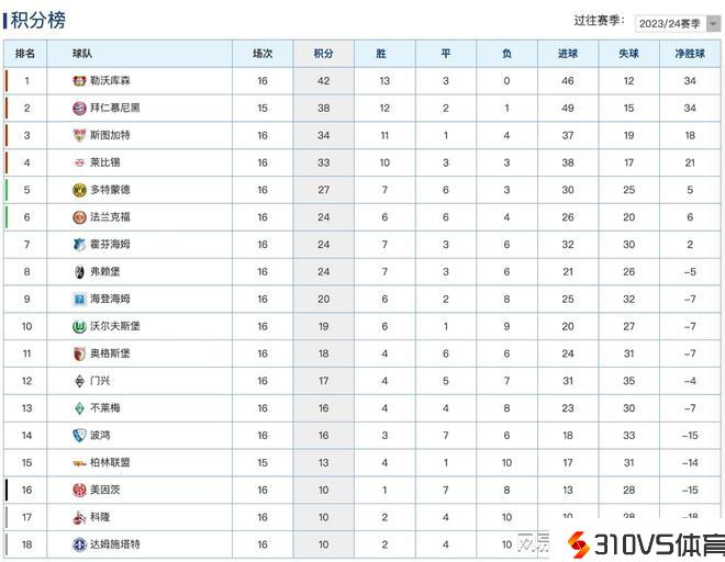 德甲最新积分榜:勒沃库森大胜4分领跑,拜仁客胜狼堡稳居第2!