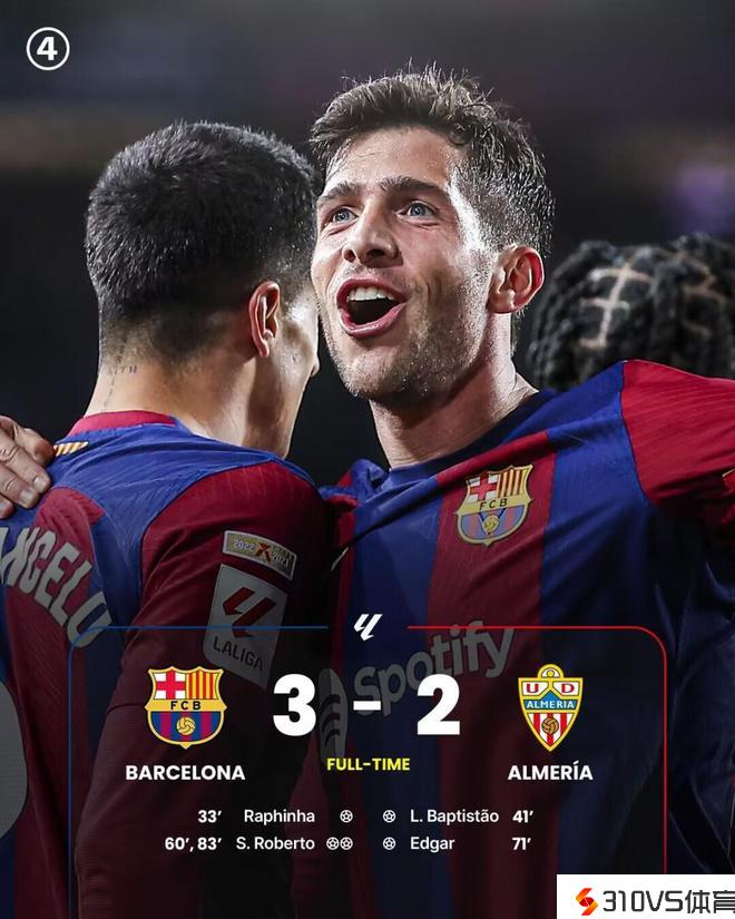 西甲第18轮,巴萨主场3-2击败阿尔梅里亚,完毕各项赛事3场不胜。阿劳霍头球被扑,拉菲亚补射首开纪录,阿劳霍失误,巴普蒂斯塔破门扳平,罗贝托头球再度抢先,佩尼亚被阿劳霍撞倒脱手,埃德加打入空门,莱万助攻罗贝托梅开二度。