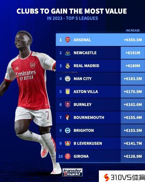 德转评2023年球员身价下跌最多十家俱乐部:阿森纳3.5亿欧居首