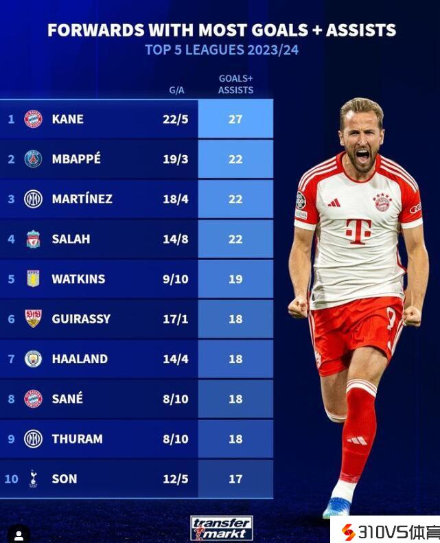 本赛季五大联赛参与进球最多的锋线球员:凯恩27球领衔