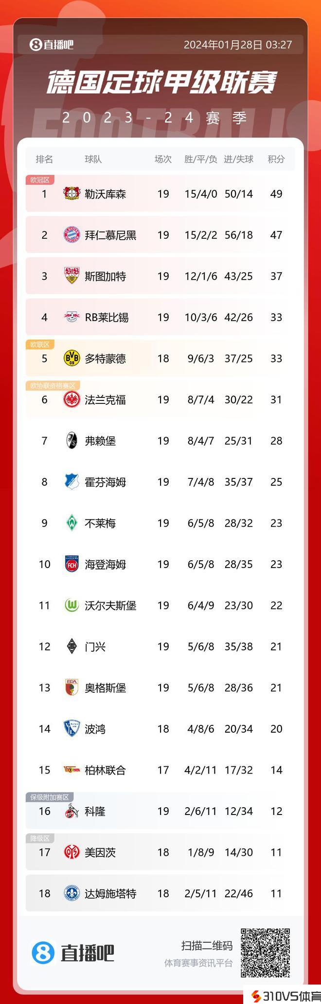 德甲积分榜:药厂完毕联赛4连胜仅抢先拜仁2分,下下轮直接对话