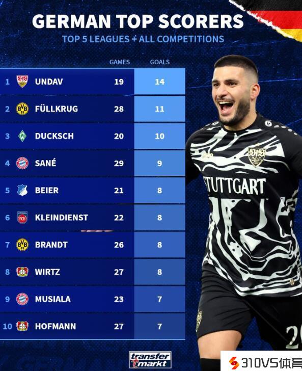 德国球员本赛季进球数:昂达夫14球最高,菲尔克鲁格第二
