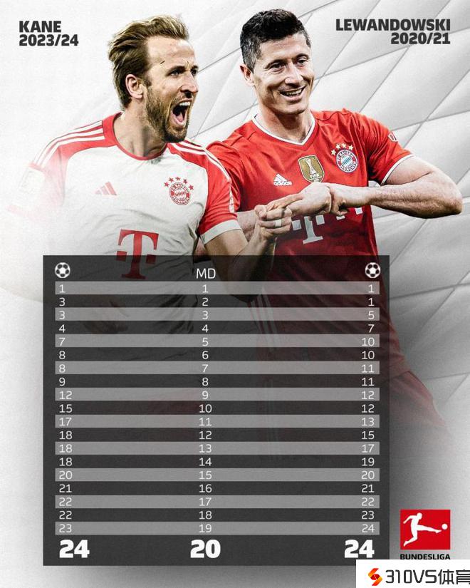 能否打破纪录?凯恩20轮进24球,与莱万41球赛季同期进球相反