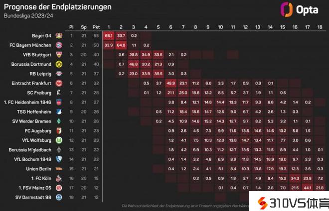 Opta本赛季德甲最新夺冠概率:勒沃库森66.1%,拜仁33.9%
