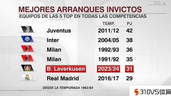 ESPN统计了1963-1964赛季以来五大联赛球队赛季残局不败的场次,并列出榜单,尤文以42场居首,勒沃库森31场排名第五位。