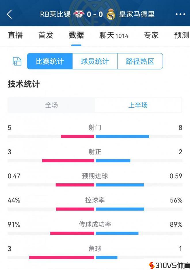 皇马0-0莱比锡半场数据对比:射门8-5,射正2-3