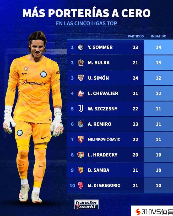 据德国转会市场统计,本赛季五大联赛截至目前,国米门将索默以14场零封独居零封榜榜首,什琴斯尼并列第五,勒沃库森门将赫拉德茨基并列第8。