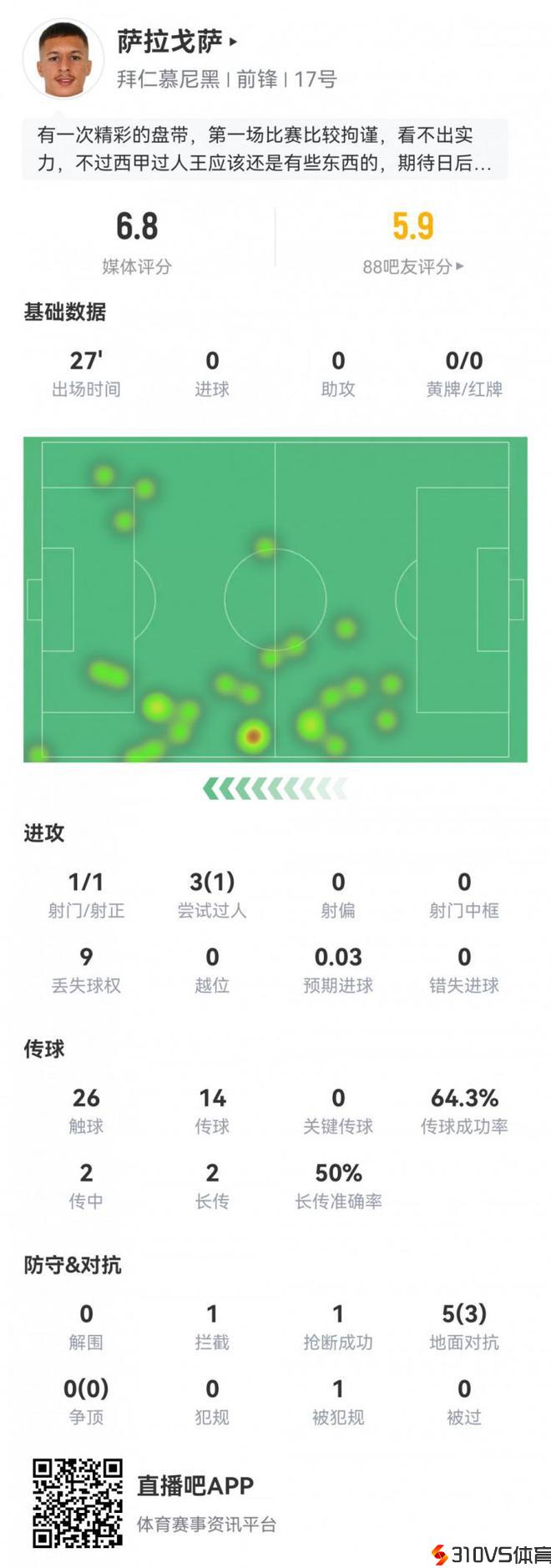 萨拉戈萨首秀数据:替补27分钟,1射1正,获评6.8分