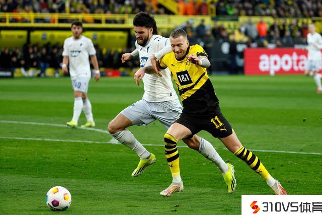 2月25日,多特蒙德队球员罗伊斯(右)与霍芬海姆队球员格里利奇在竞赛中拼抢。新华社发(约阿希姆·毕瓦勒兹摄)