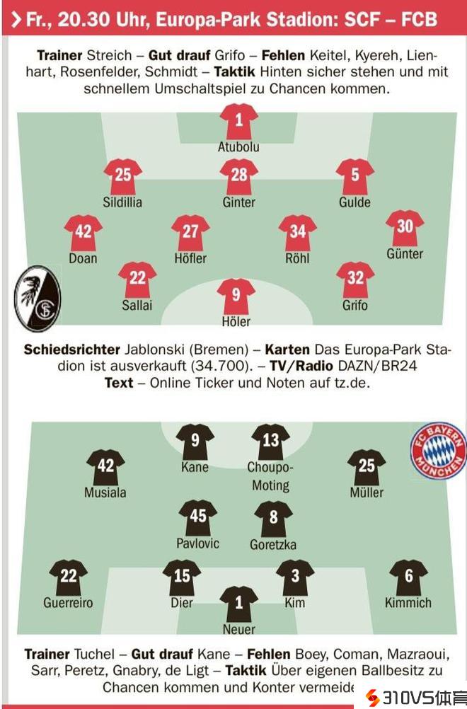 拜仁客战弗赖堡首发预测:凯恩、舒波-莫廷双前锋