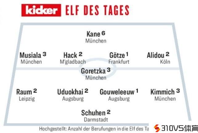 踢球者评德甲本轮最佳:凯恩领衔拜仁4人中选,格策上榜