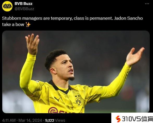 多特球迷号晒桑乔照片:顽固的主帅是暂时的,而才气是永世的