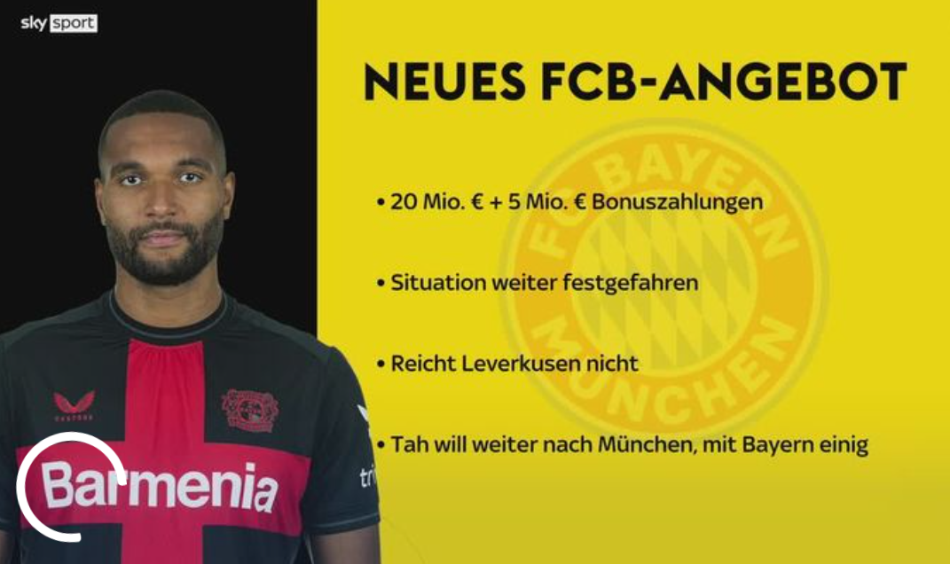 乔纳森·塔与勒沃库森的合同到2025年6月到期,拜仁在几天前向勒沃库森提交了一份2000万欧元基础转会费外加500万欧元奖金的报价,在之前的1800万欧元+200万欧元的报价基础上增加了数百万欧元。