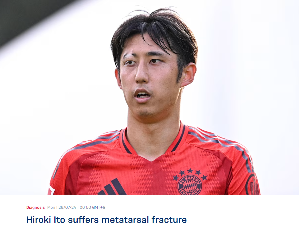 拜仁官方宣布,球队的新援伊藤洋辉在对阵杜伦的友谊赛中跖骨骨折。