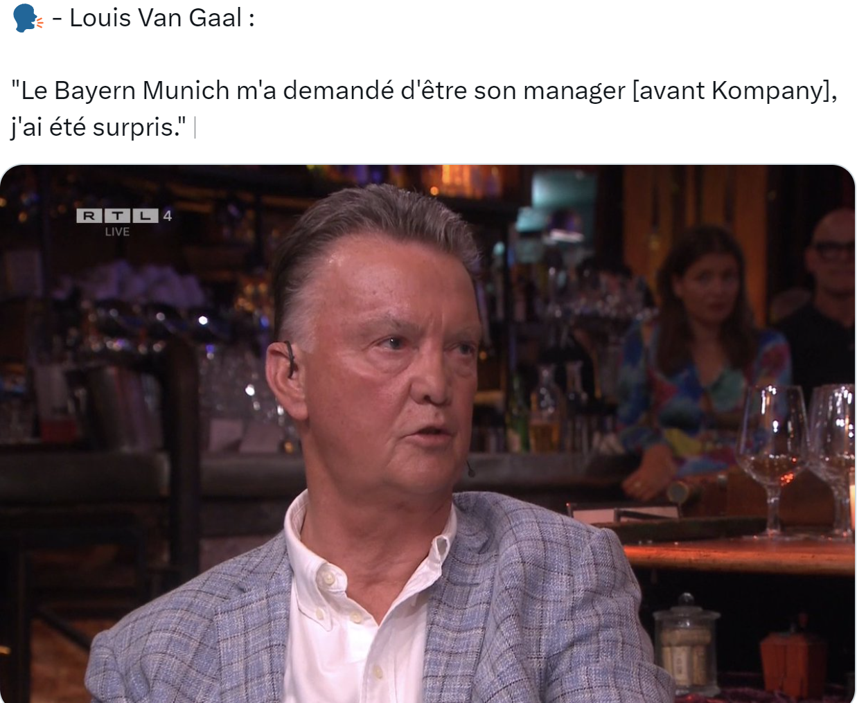 72岁的前巴萨、拜仁、曼联、荷兰队主帅范加尔接受了荷兰RTL电视台的专访,老帅透露,拜仁在任命孔帕尼出任教练之前,曾经邀请他执教。此外,他的癌症情况控制的很好。