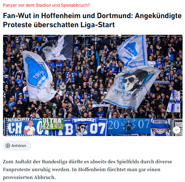 新赛季的德甲在一片抗议声中拉开序幕,根据德国媒体的报道,极端球迷的抗议行为,有可能让霍芬海姆主场和基尔的比赛无法按照正常计划展开。而多特蒙德、RB莱比锡主场未来都还会有持续的抗议行为。