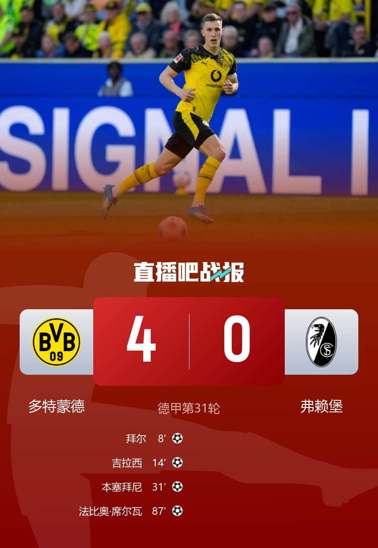 结束两连败!多特4-0弗赖堡 本塞拜尼传射拜尔吉拉西破门
