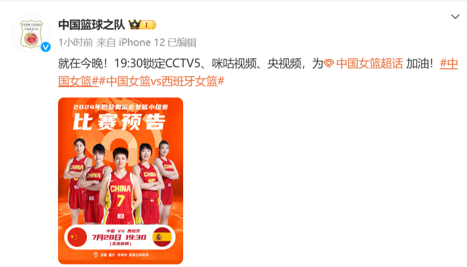 📸加油!中国篮球之队发布中国女篮奥运会首战海报:就在今晚