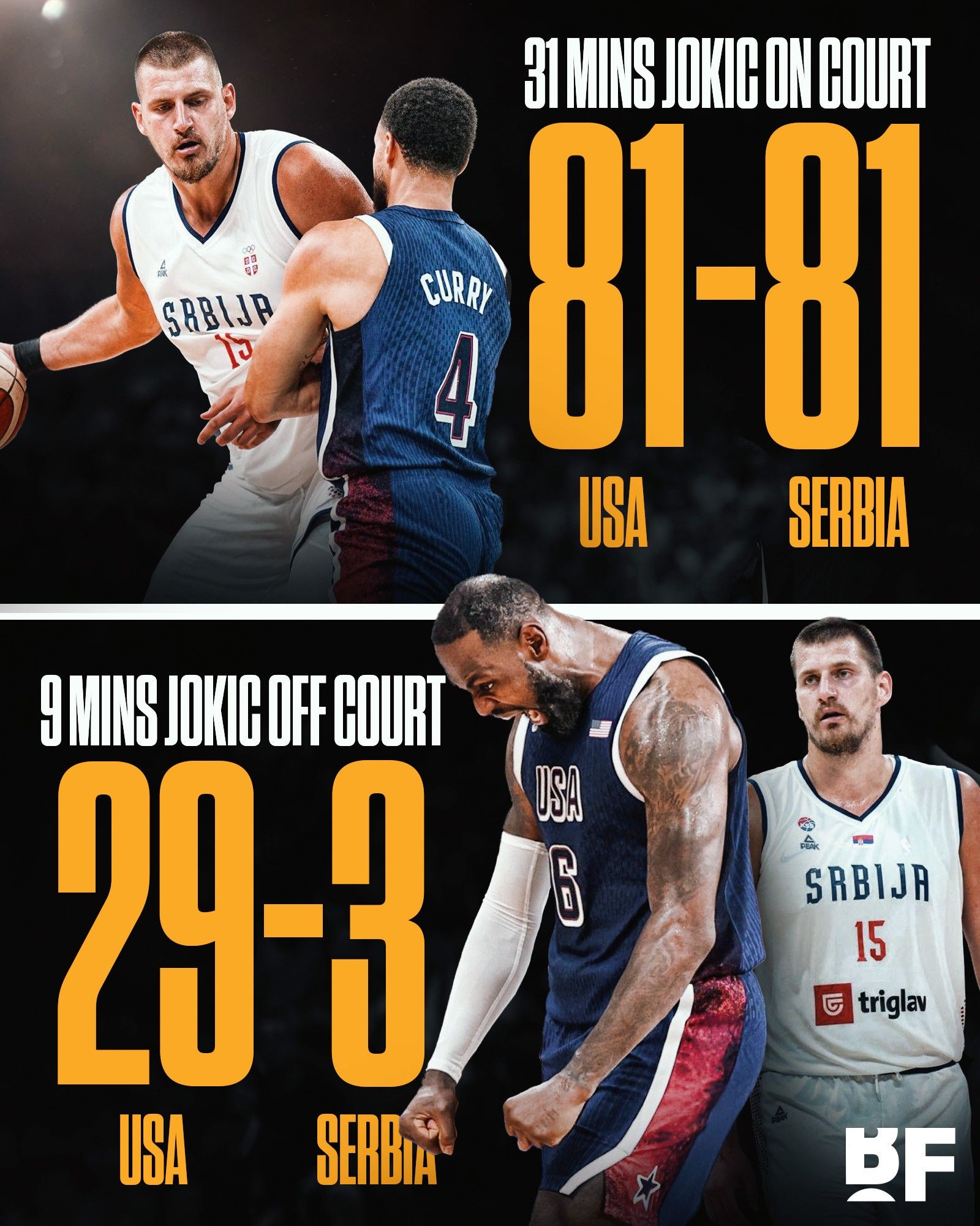 约基奇不在场的9分钟,塞尔维亚只得到了3分,而美国男篮则是轰下29分。