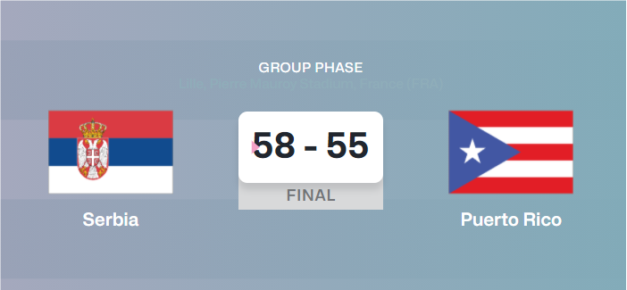 B组中有中国、西班牙、塞尔维亚和波多黎各4支球队,率先结束的比赛中,中国女篮经过加时1分惜败给西班牙。塞尔维亚对阵波多黎各,前三节塞尔维亚一直压制波多黎各,带着19分优势进入最后一节,不过末节风云突变,波多黎各打出一波19-2一度追到只差2分,最后时刻塞尔维亚球员两罚一中,最终惊险获胜,拿下开门红。