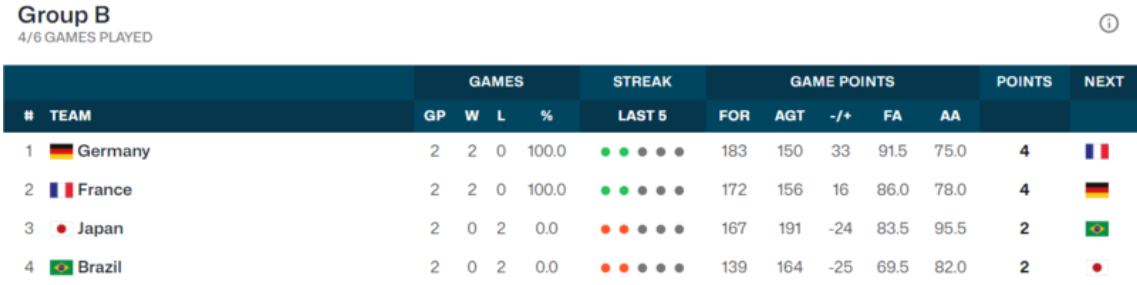 率先结束的一场比赛中,法国经过加时94-90险胜日本,同样取得两连胜。本小组的前两轮比赛结束,德国与法国均取得两连胜,提前从小组出线,末轮两队将直接遭遇,胜者将获得小组第一。日本和巴西均遭遇两连败,不过都没有丧失出线希望,末轮两队将直接交手,胜者将获得小组第三,会与其他两个小组的第三比较战绩,仍有出线希望。