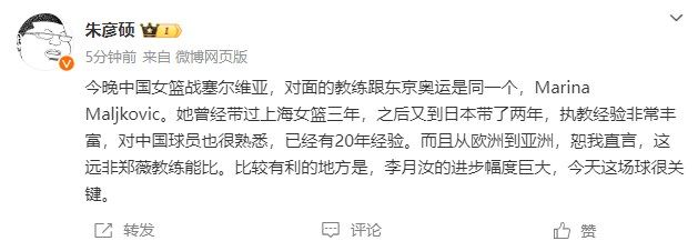 “今晚中国女篮战塞尔维亚,对面的教练跟东京奥运是同一个,Marina Maljkovic。她曾经带过上海女篮三年,之后又到日本带了两年,执教经验非常丰富,对中国球员也很熟悉,已经有20年经验。而且从欧洲到亚洲,恕我直言,这远非郑薇教练能比。比较有利的地方是,李月汝的进步幅度巨大,今天这场球很关键。 ”