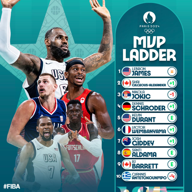 👀奥运男篮MVP榜单:詹姆斯霸榜 杜兰特空降第5 字母哥狂跌4位