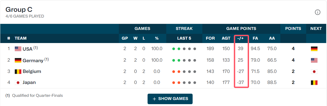 美国女篮两连胜,与同为两连胜的德国女篮提前出线,末轮两队直接交手,争夺小组第一。比利时和日本同为两连败,末轮争夺小组第三。目前日本女篮的净胜分是-37,比利时的净胜分是-27,都低于中国女篮的-23,由于三个小组中两个成绩最好的小组第三也能出线,考虑到比利时和日本的实力相对比较接近,不太容易打出大分差,中国女篮还是有很大的出线希望,末轮他们要做的就是尽可能大的分差战胜波多黎各,然后等待机会。