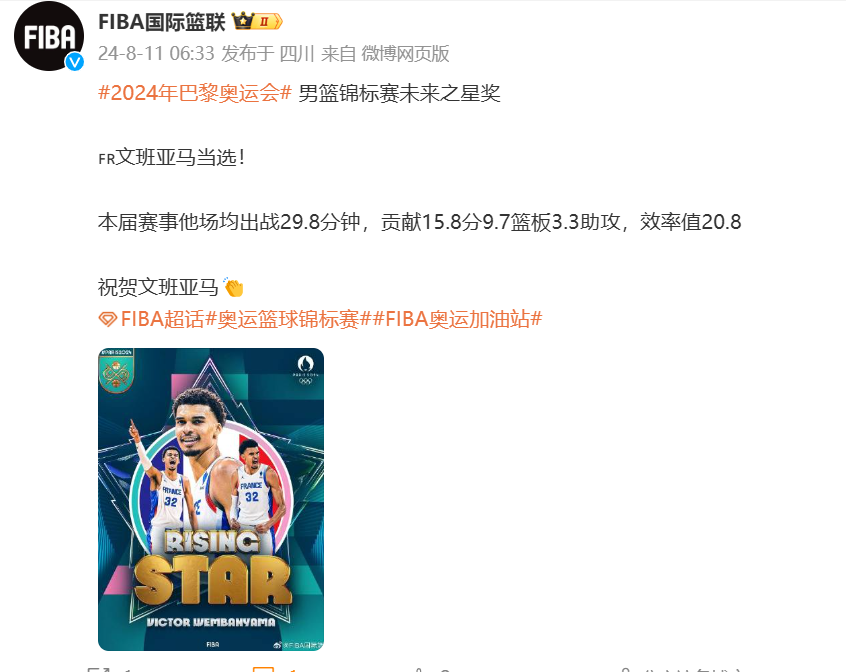 🌟FIBA官方:文班亚马获得本届奥运会男篮未来之星奖