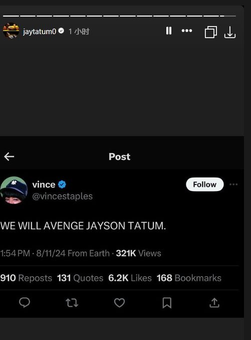 今日,说唱歌手vince发布社媒表示,“我们会为塔图姆复仇。”