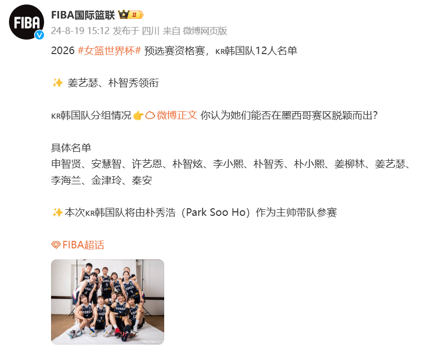 🌟FIBA公布2026世界杯预选赛资格赛韩国女篮12人大名单:朴智秀领衔