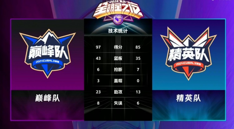 末节之争手握两位数领先的巅峰队打得更加放松也效果更好,丁超外线开火连续命中三分,这其中还包括一记3+1,吴超则强突直接完成扣篮带队确立起20分以上的优势。辛泽林的三分为精英队止血,但回头就被张高铭回敬三分answer ball。巨大分差也让比赛失去悬念,随后双方也进入“全明星式”的对攻打完剩余时间。最终,巅峰队97-85轻取精英队拿下今年的全明星之夜胜利,砍下全场最高14分的丁超荣膺MVP。