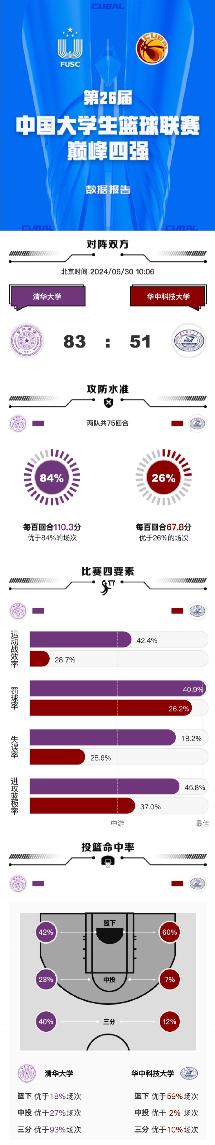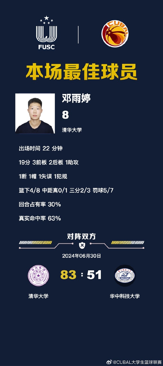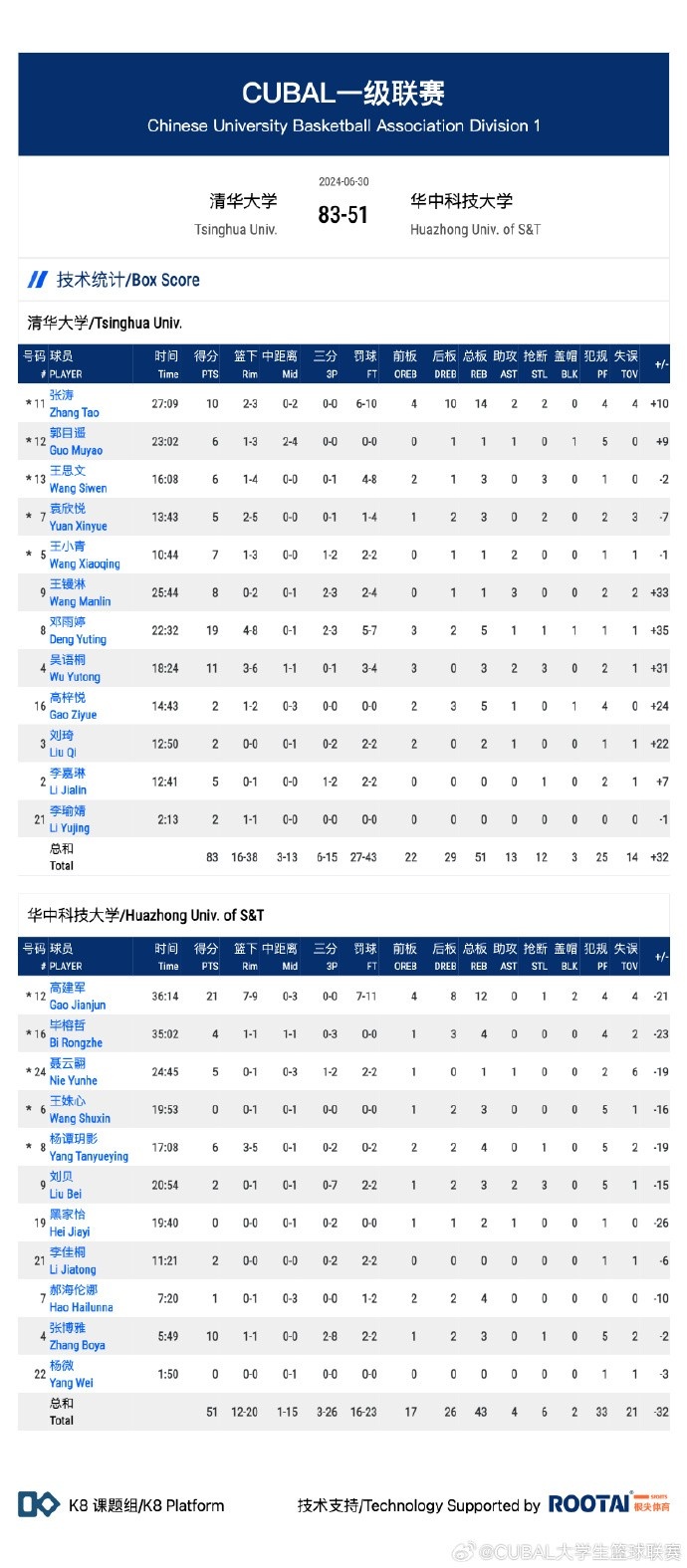 清华大学:邓雨婷19分5篮板、吴语桐11分3篮板2助攻3抢断、张涛10分14篮板2助攻2抢断、郭目遥6分、王思文6分3篮板、王镘淋8分3助攻。