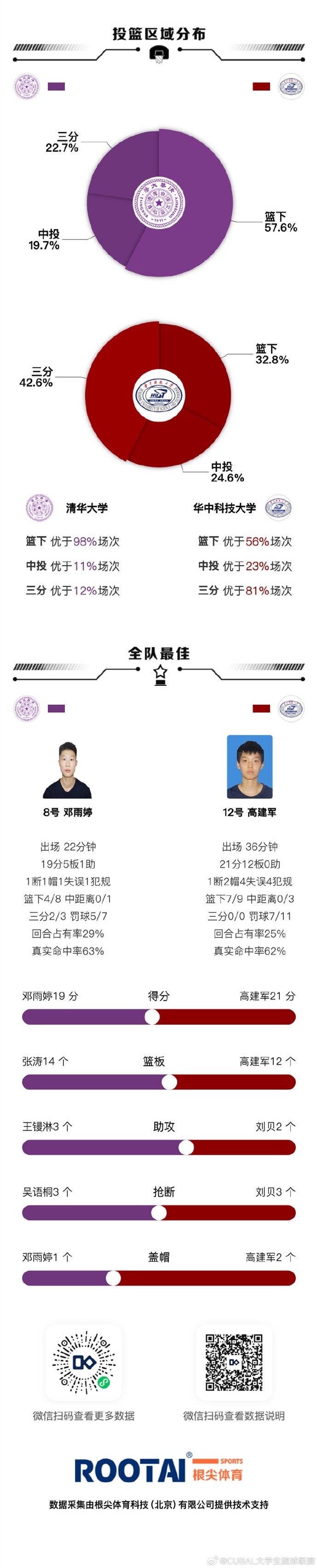 华中科技大学:高建军21分12篮板2封盖、张博雅10分3篮板、杨谭玥影6分4篮板、聂云翮5分、毕榕哲4分4篮板。