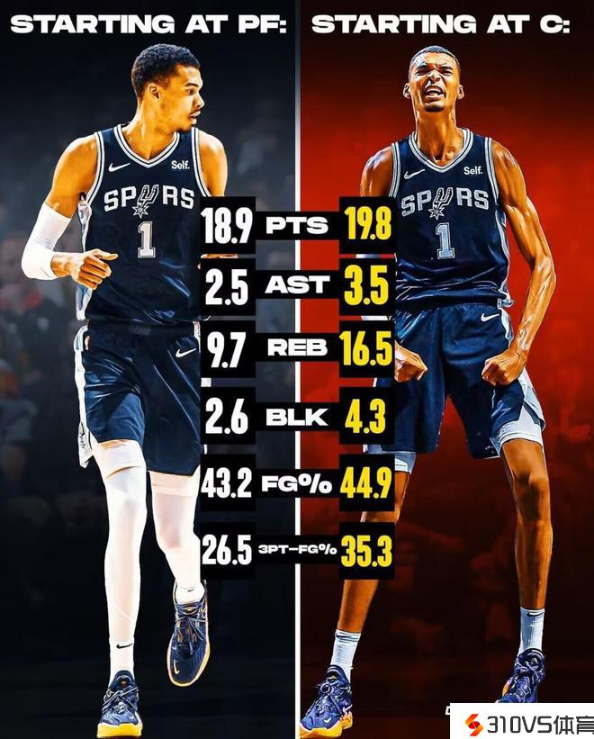 clutchpoints晒出的数据显示,文班亚马打大前锋时,场均18.9分9.7篮板2.5助攻2.6盖帽,投篮命中率43.2%,三分命中率26.5%,而当他打中锋时,场均19.8分16.5篮板3.5助攻4.3盖帽,投篮命中率44.9%,三分命中率35.3%。最大的两项变化在于文班亚马的场均篮板和盖帽!