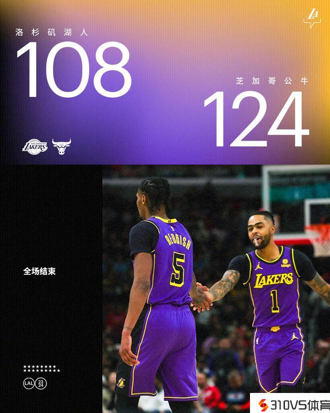 勒布朗和戴维斯追回5分,德罗赞两罚全中,武切维奇左翼命中三分,第四节还有2分25秒时公牛队以120-103抢先。最后时辰湖人队有力回天,他们以108-124落败。