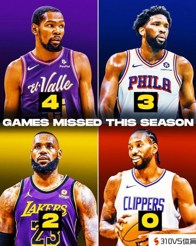 美媒晒本赛季球星出勤:小卡全勤 老詹列席2场 KD3场恩比德4场