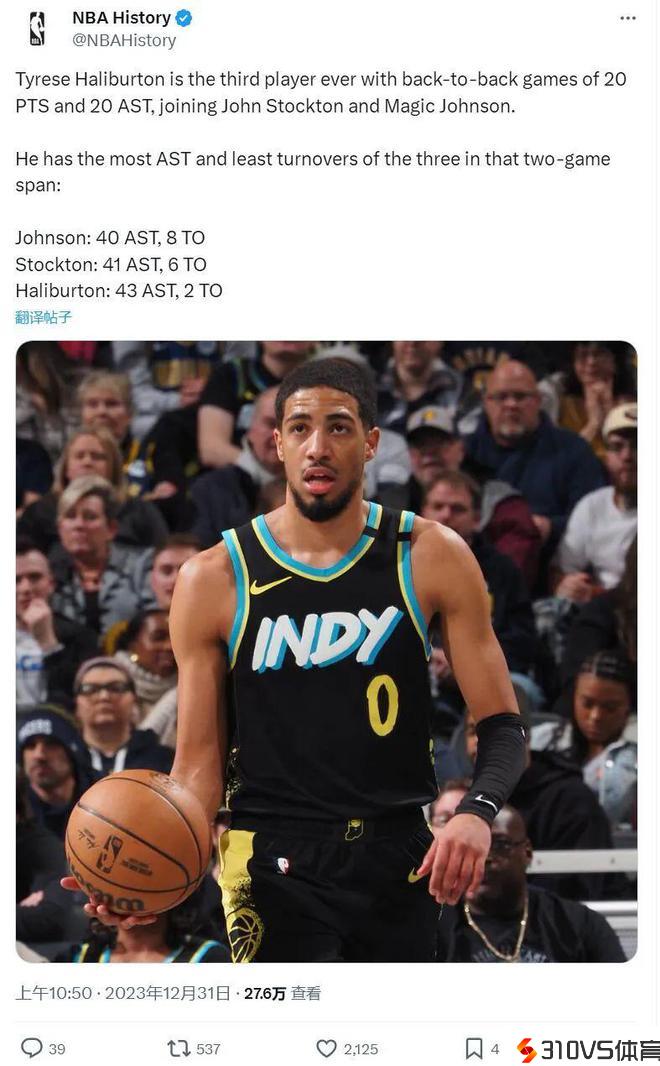 能跟魔术师和斯托克顿相提并论,而且失误数还是三人当中最少的,哈利伯顿的表现觉得值得称赞。单场23助攻不只是哈利伯顿团体生涯新高,也追平步行者队史纪录。以哈利伯顿本赛季的炽热表现,打破队史纪录可以说板上钉钉。