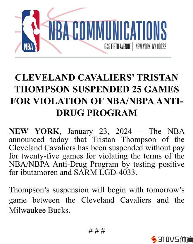 NBA官方:特里斯坦-汤普森因违犯联盟禁毒条例被禁赛25场