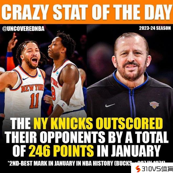 尼克斯一月份净胜对手246分 历史第二高&仅次于1971年雄鹿