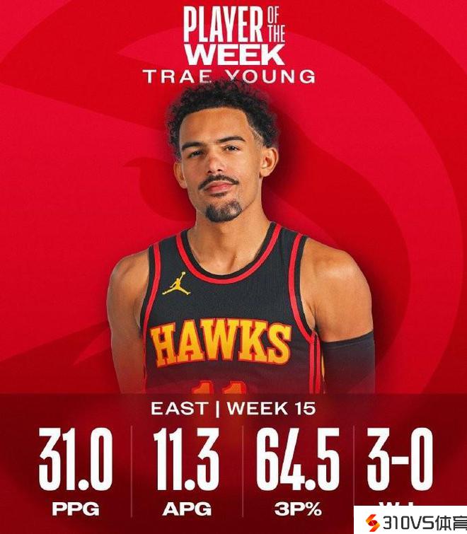 特雷-杨上周场均失掉31分11.3助攻,三分命中率64.5%,率领老鹰取得3胜0负。