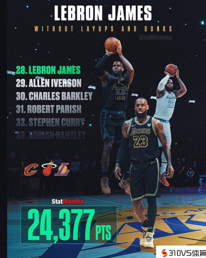 太顶尖了!詹姆斯去掉上篮和扣篮还有24377分排历史第28 高于库里