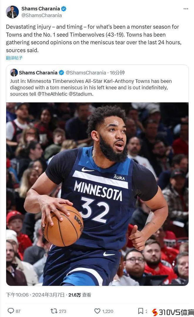 为啥说这个音讯很突然?3月4日森林狼88-89惜败快船:唐斯出战34分钟,18投7中,失掉18分9篮板8助攻,正负值+14。3月5日森林狼119-114打败开拓者:唐斯12投5中,失掉12分4篮板2盖帽,正负值+1,都没看出受伤的迹象。