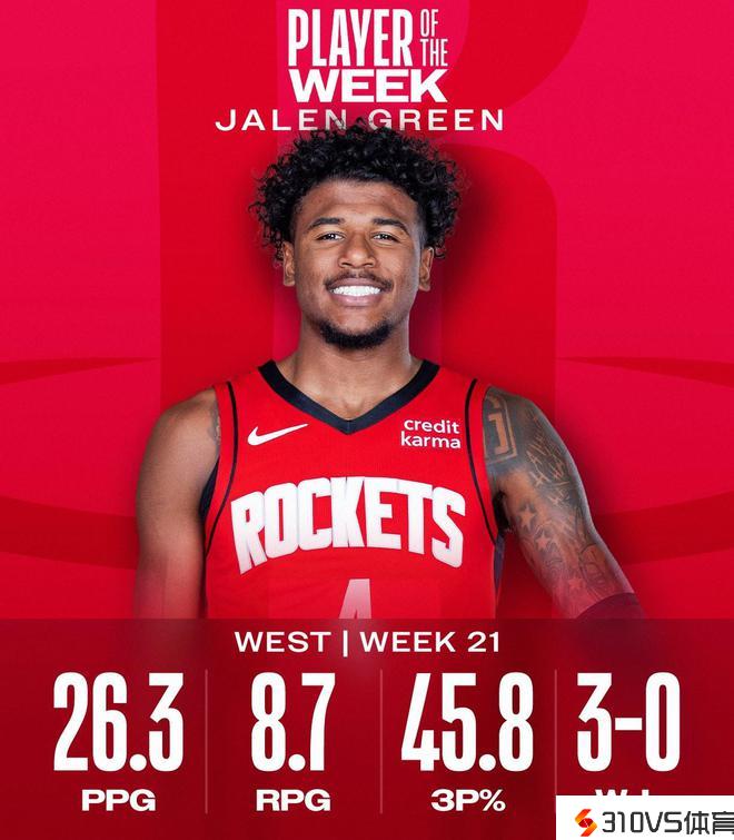 杰伦-格林上周率领火箭取得了3胜0负的战绩,他团体场均拿到26.3分,8.7篮板,三分命中率高达45.8%